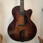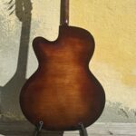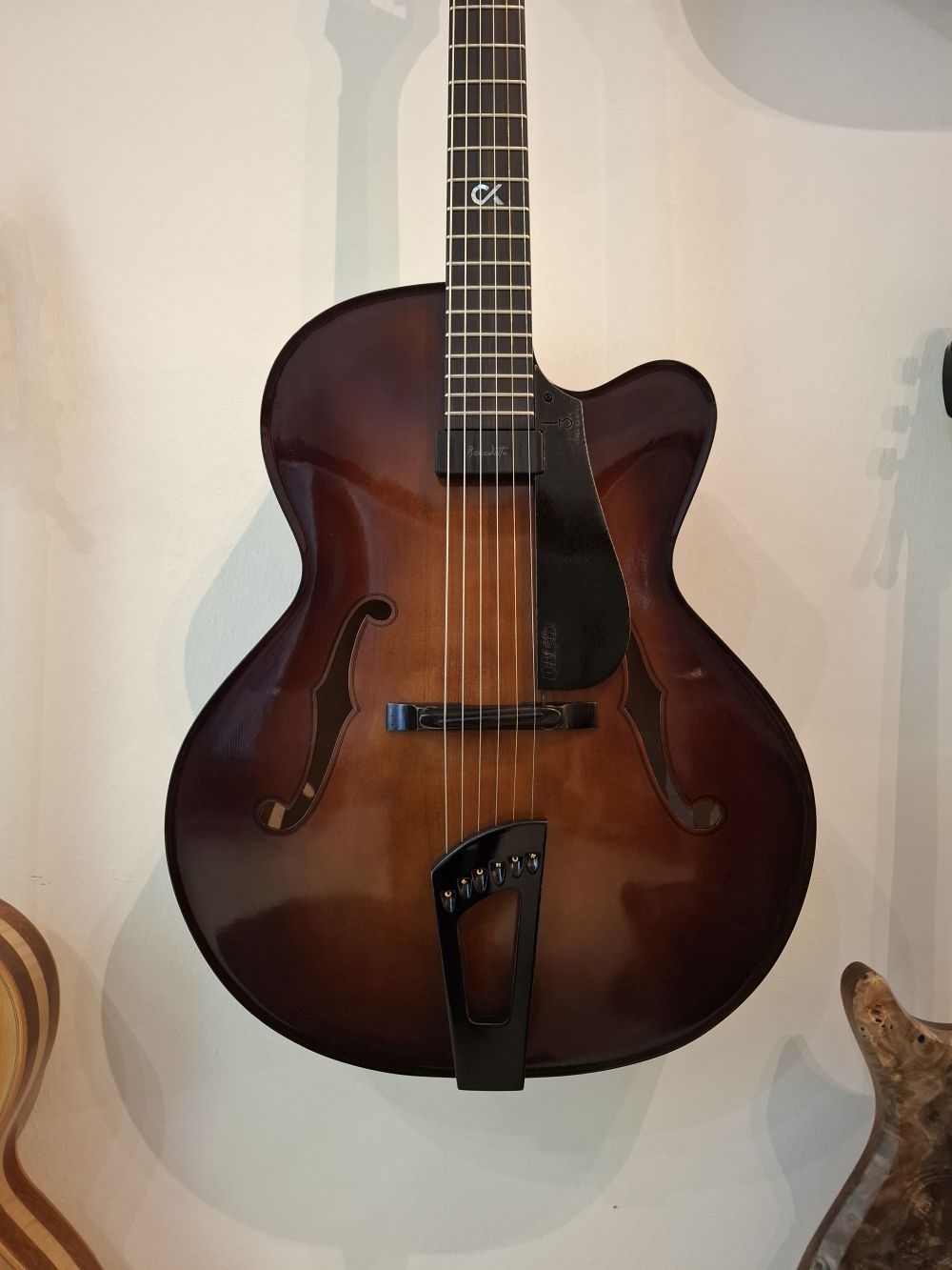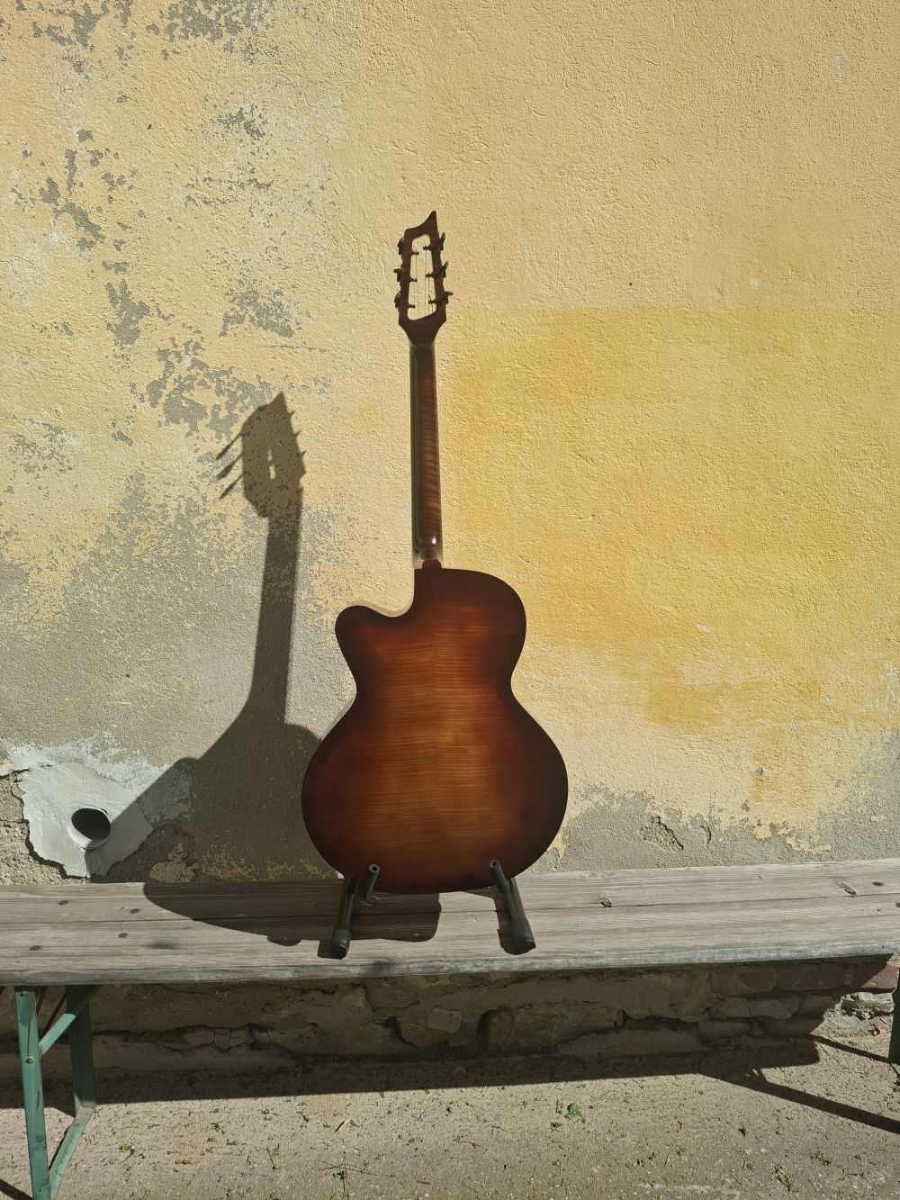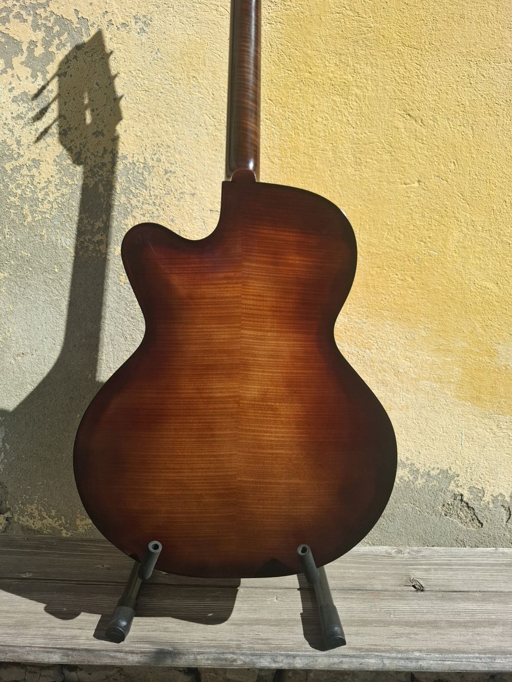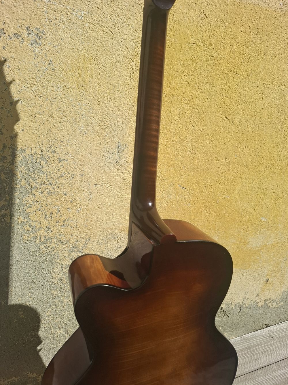 Riegelahorn Korpus, Zargen und Boden, Bergfichtendecke, Palisander Ränder mit Geigenspan, Ahorn Hals, Custom Brücke, Schlagbrett und Saitenhalter aus Bergahorn gebeizt und lackiert (vintage), Scheller Gitarrenmechaniken, Geigenlack, Karbonsattel und Stegeinlage, Perlmuttinlay am 12.Bund.