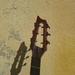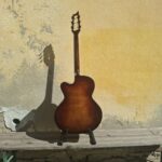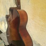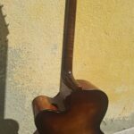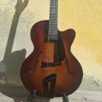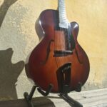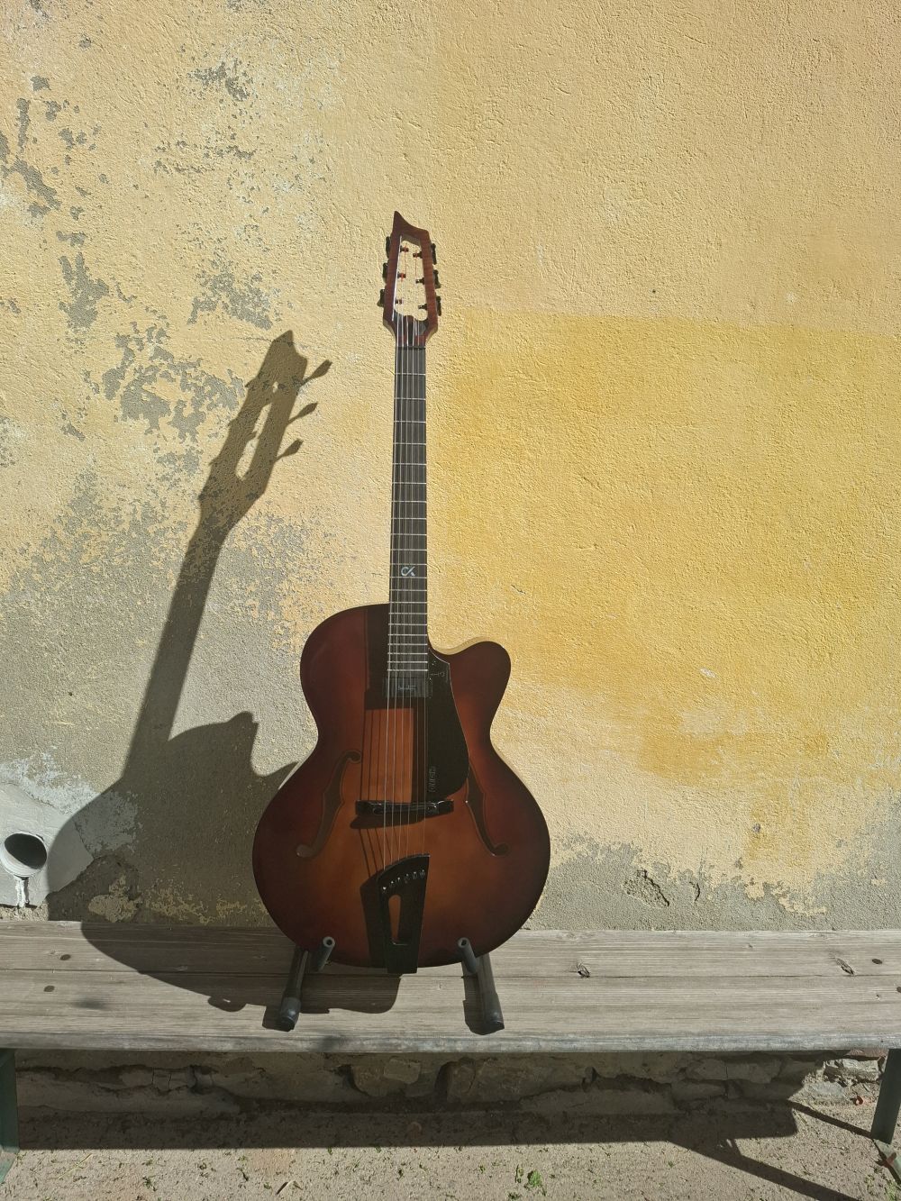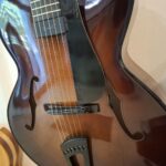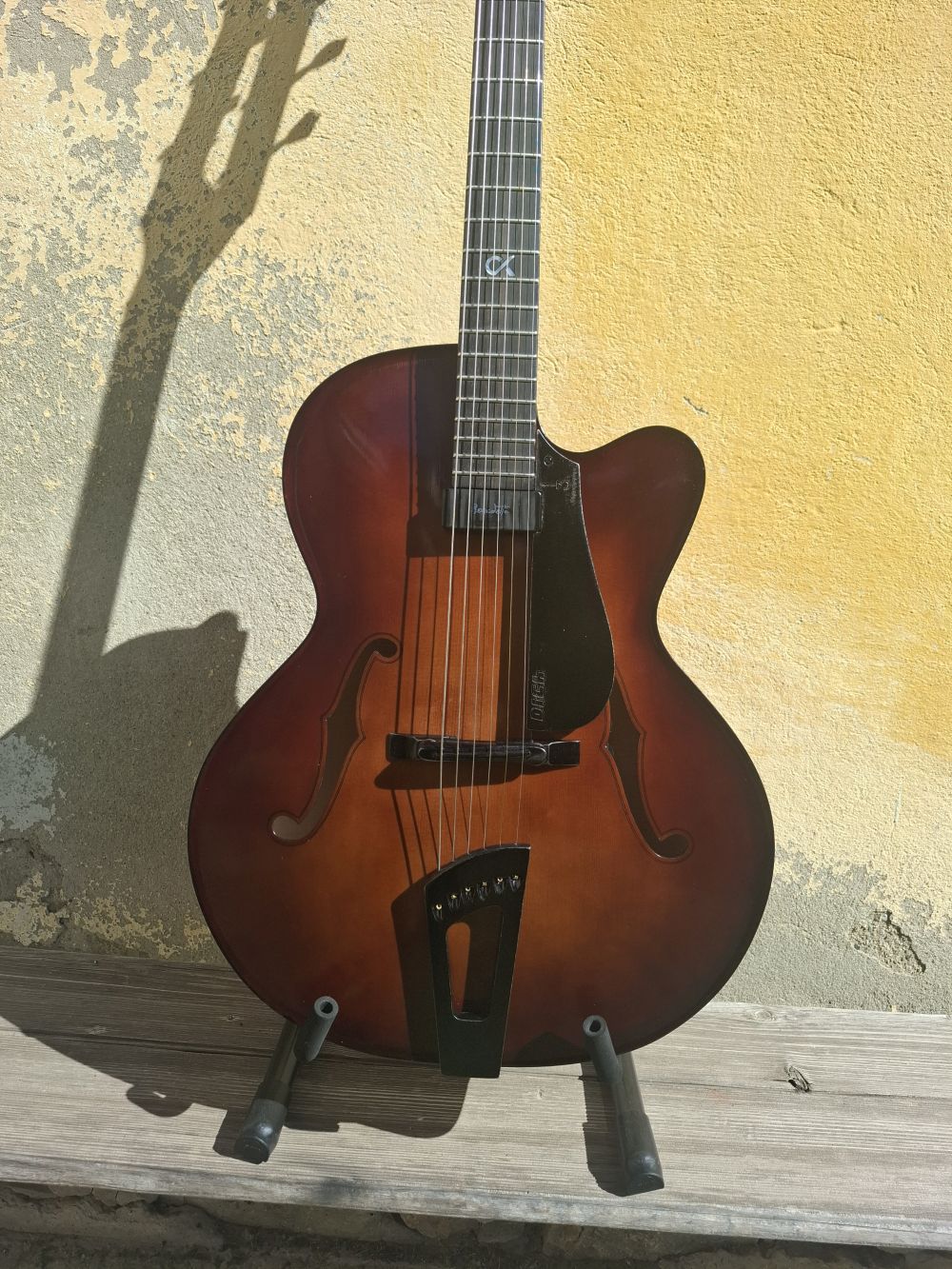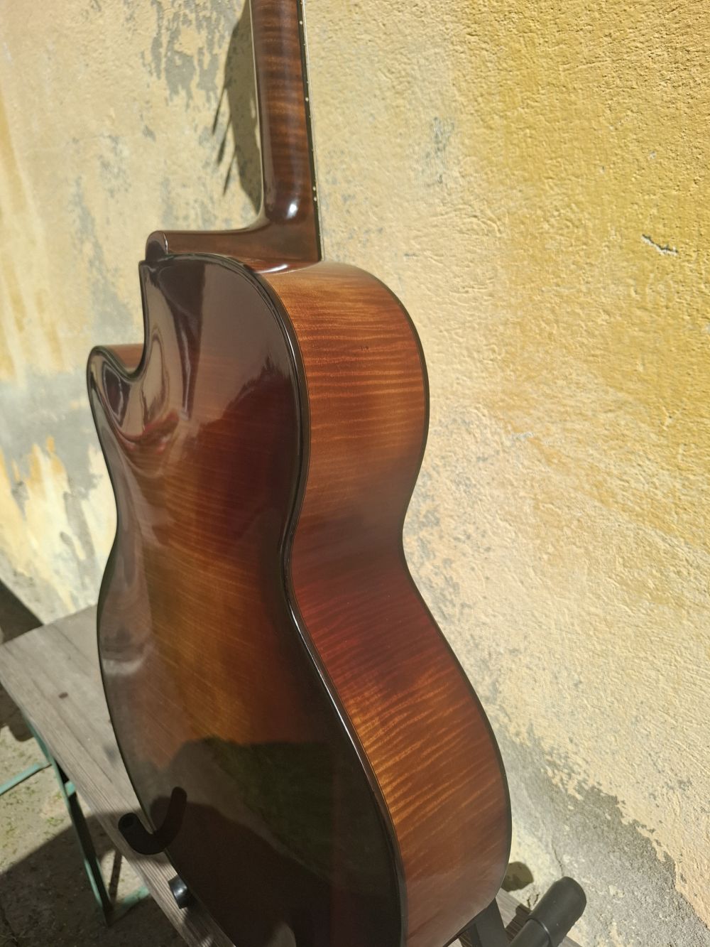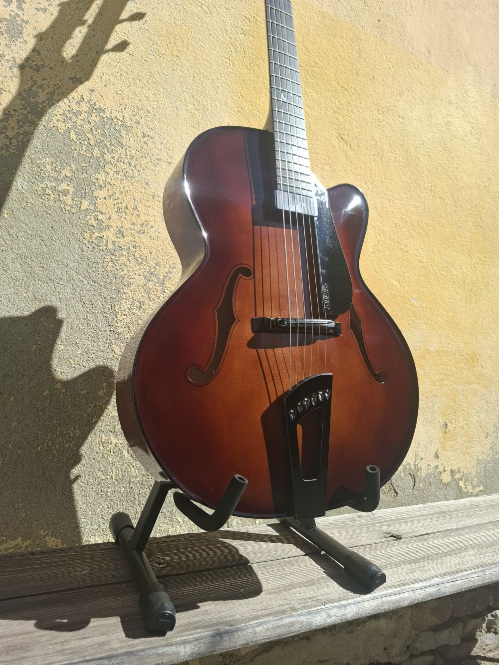 Riegelahorn Korpus, Zargen und Boden, Bergfichtendecke, Palisander Ränder mit Geigenspan, Ahorn Hals, Custom Brücke, Schlagbrett und Saitenhalter aus Bergahorn gebeizt und lackiert (vintage), Scheller Gitarrenmechaniken, Geigenlack, Karbonsattel und Stegeinlage, Perlmuttinlay am 12.Bund.