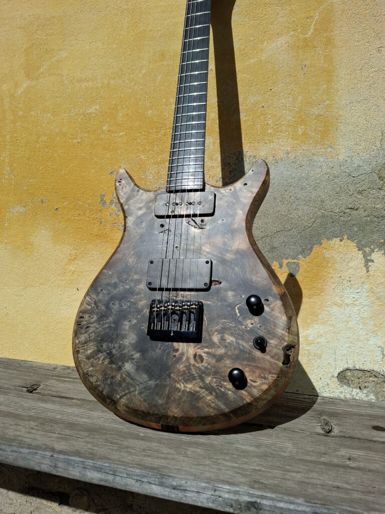 Riegelahorn Korpus, Raintree Decke , Ahorn/Wengè/Mahogoni Hals, Ebenholz Griffbrett -compound Radius, Tonepros LPBM02 B Tuneomatic Brücke, Schaller M6 mini Mechaniken, Kopfplattenfurnier gleicht dem Deckenaufleimer, geölte Oberfläche