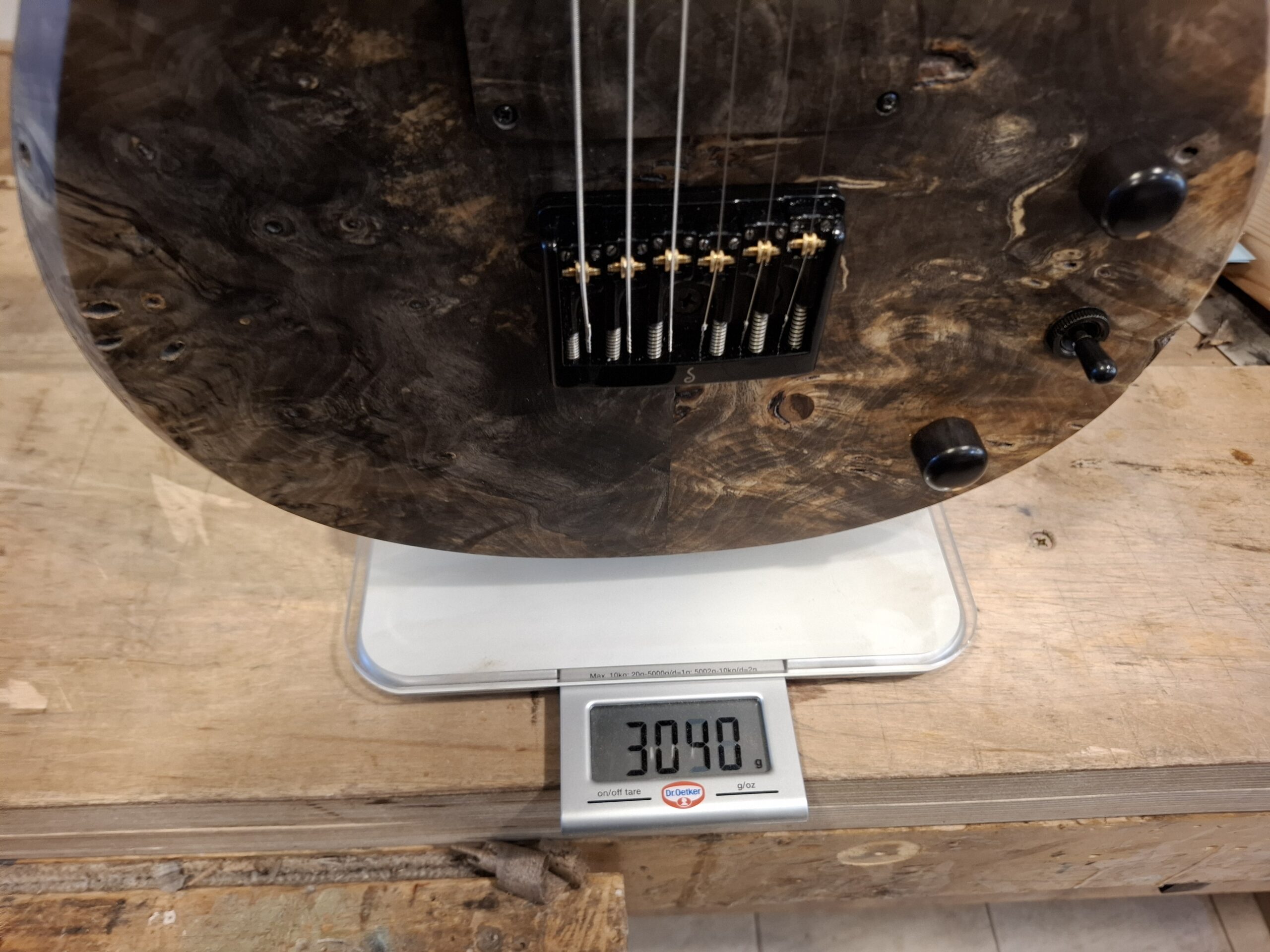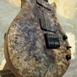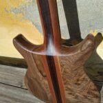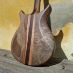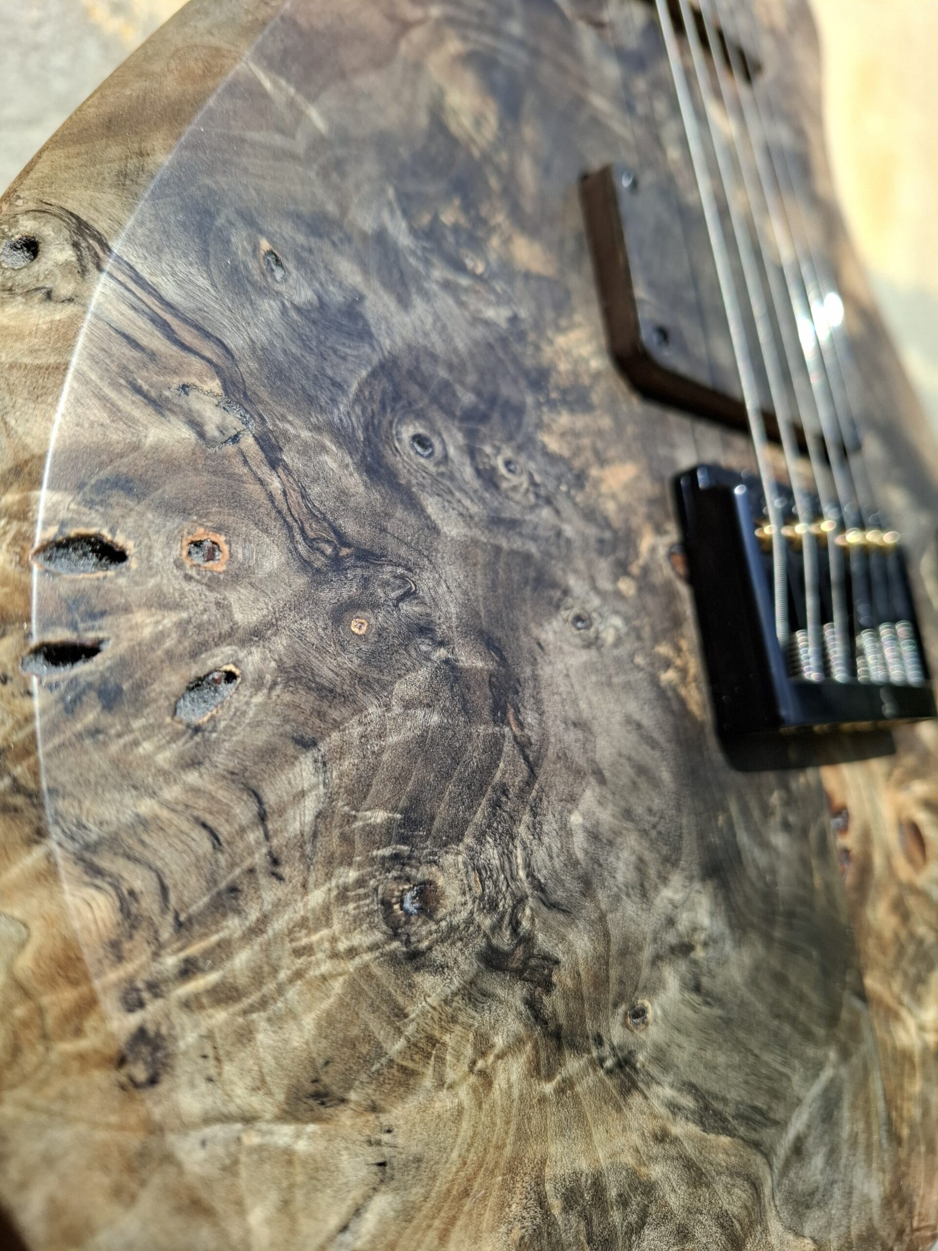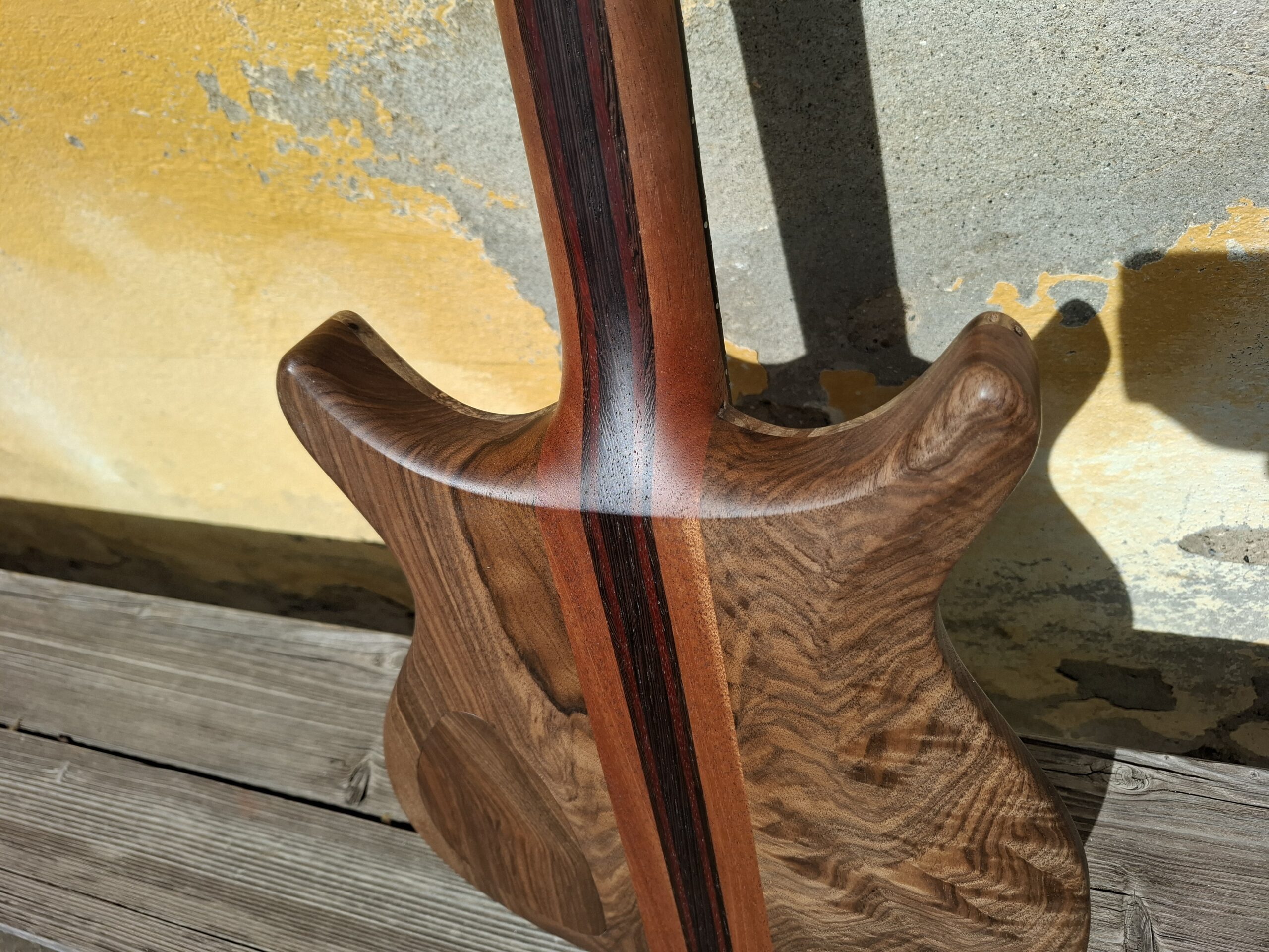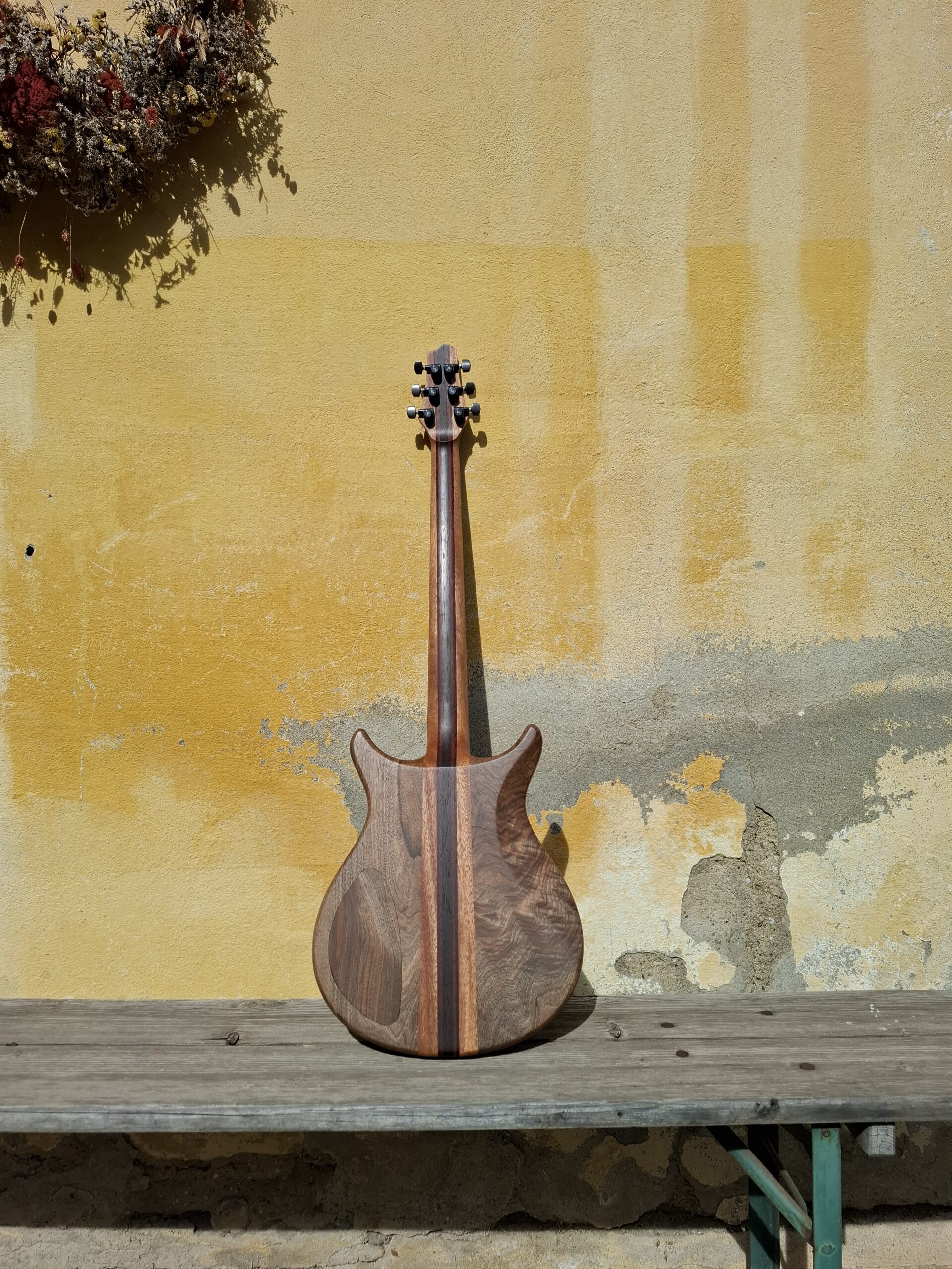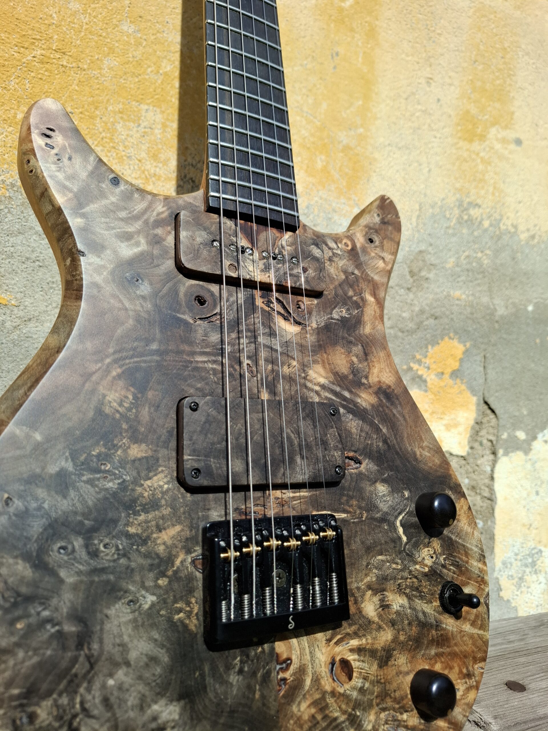 Walnuss Korpus, Rosskastanienwurzeldecke (Buckeye Burl), durch den Korpus gehender Hals (NT) aus Mahagoni, Wenge in meherern Lagen, Ebenholz Griffbrett mit Bronzebünden, die Tonabnehmer sind in Holzkappen integriert, Schaller Brücke, Schaller Locking Mechaniken, Karbon Sattel, matt lackierte Oberfläche