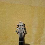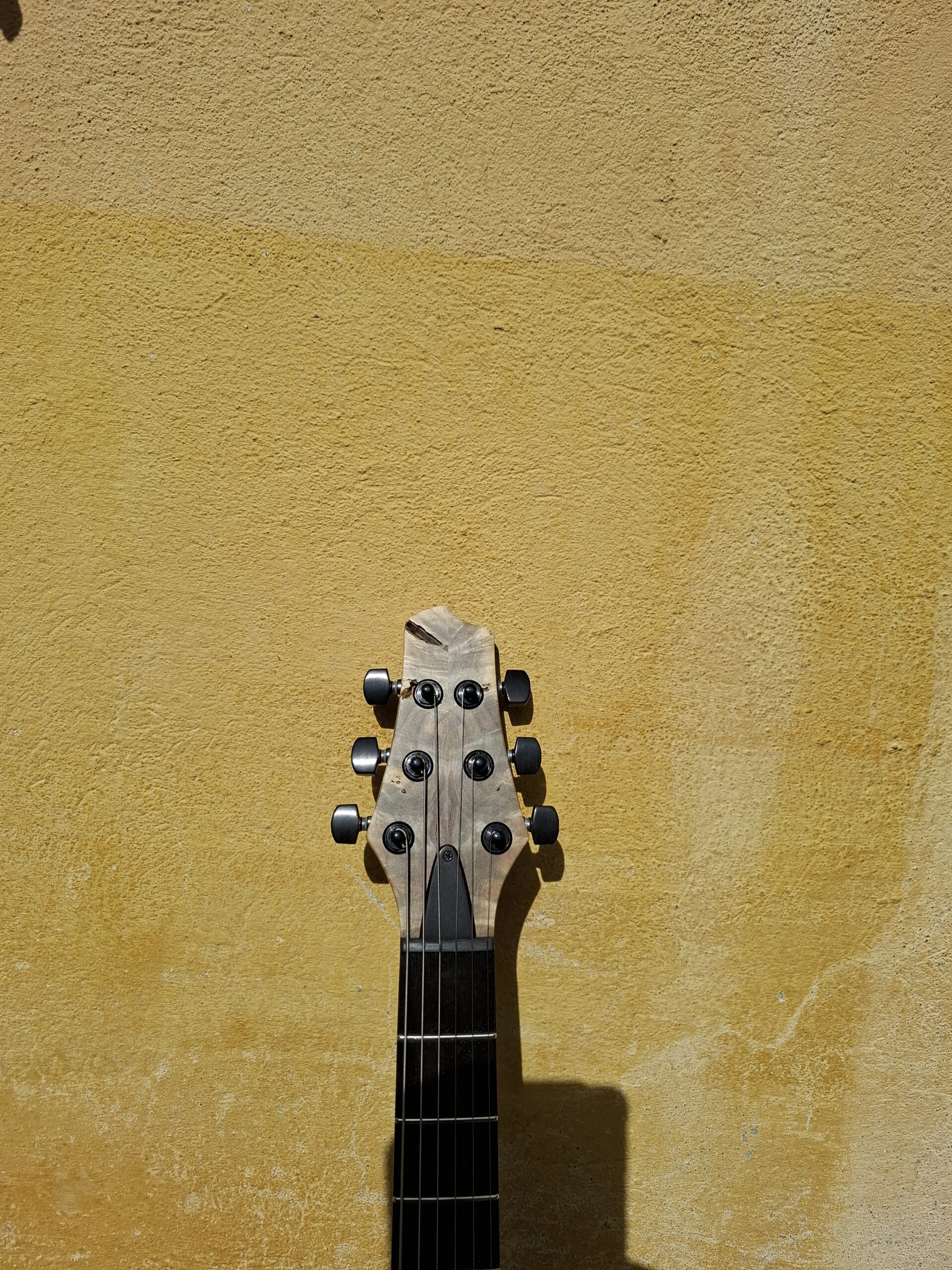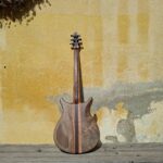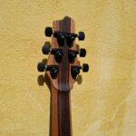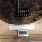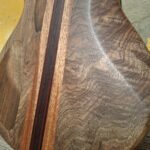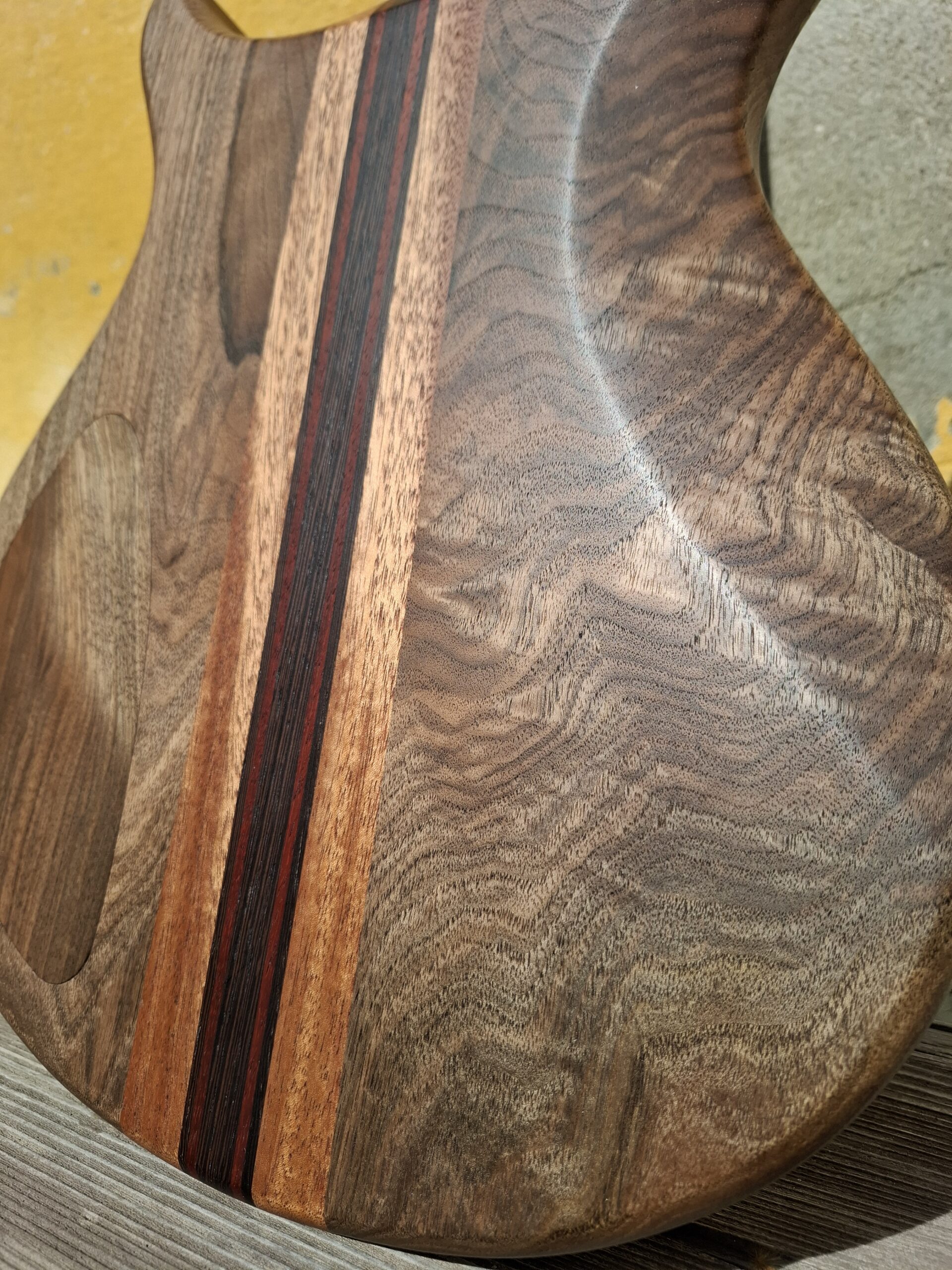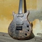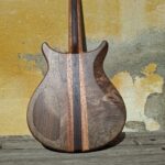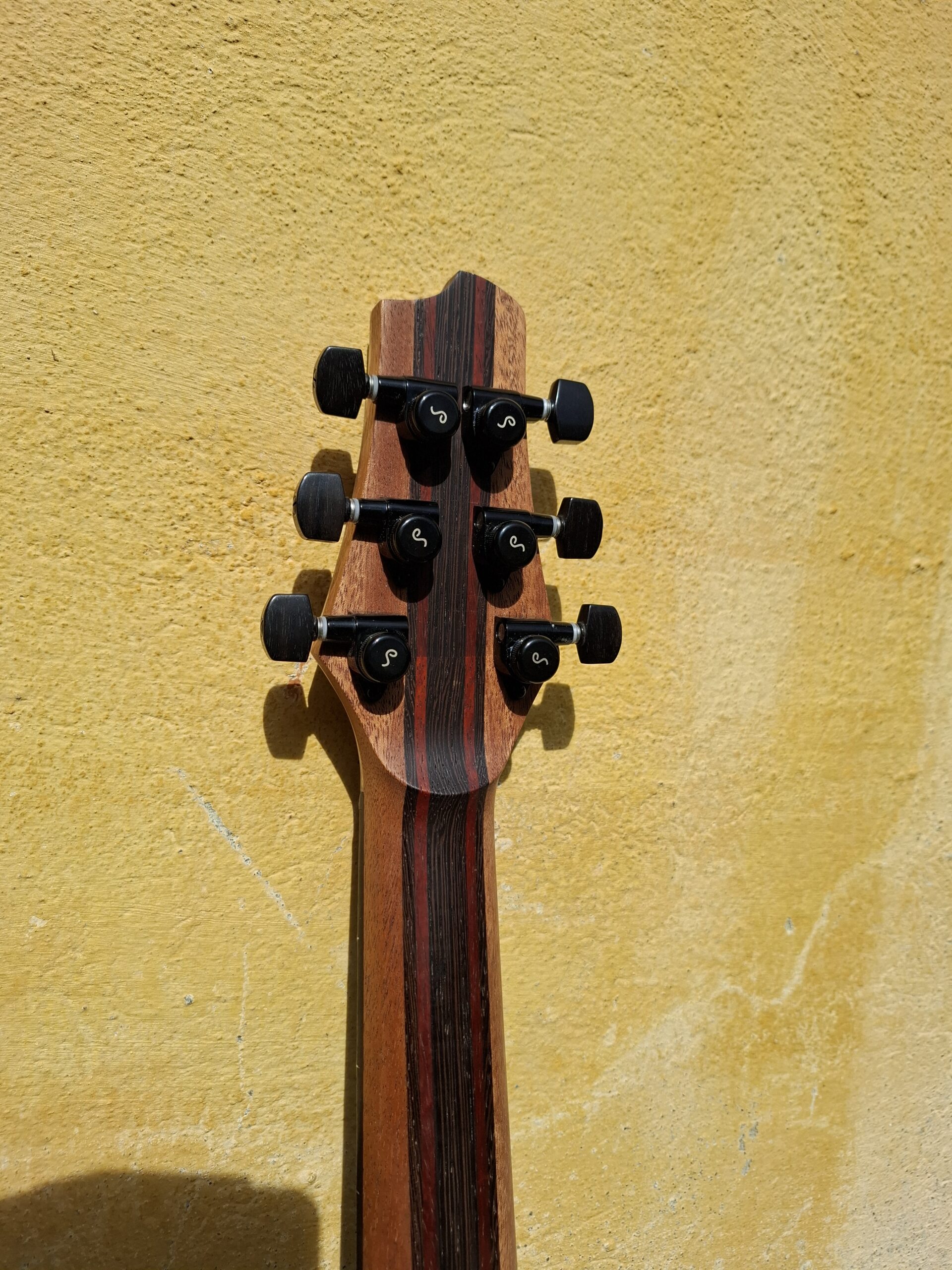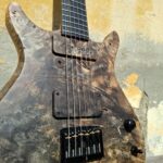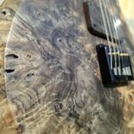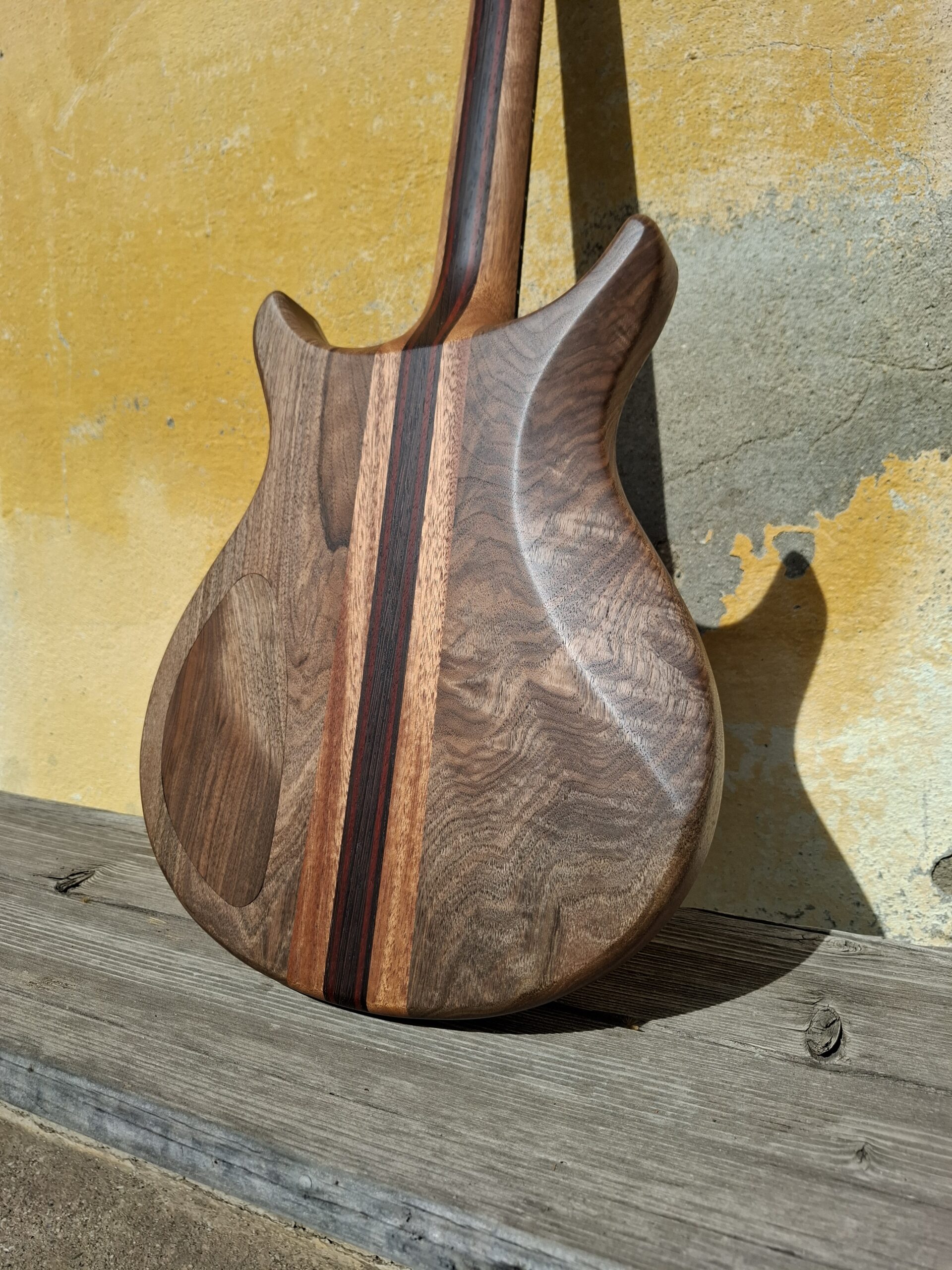 Walnuss Korpus, Rosskastanienwurzeldecke (Buckeye Burl), durch den Korpus gehender Hals (NT) aus Mahagoni, Wenge in meherern Lagen, Ebenholz Griffbrett mit Bronzebünden, die Tonabnehmer sind in Holzkappen integriert, Schaller Brücke, Schaller Locking Mechaniken, Karbon Sattel, matt lackierte Oberfläche