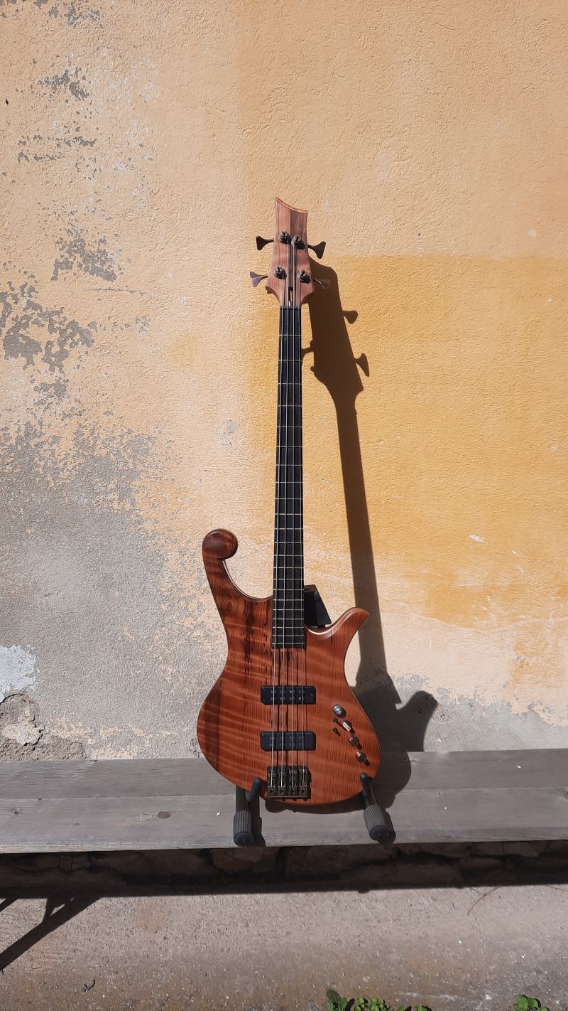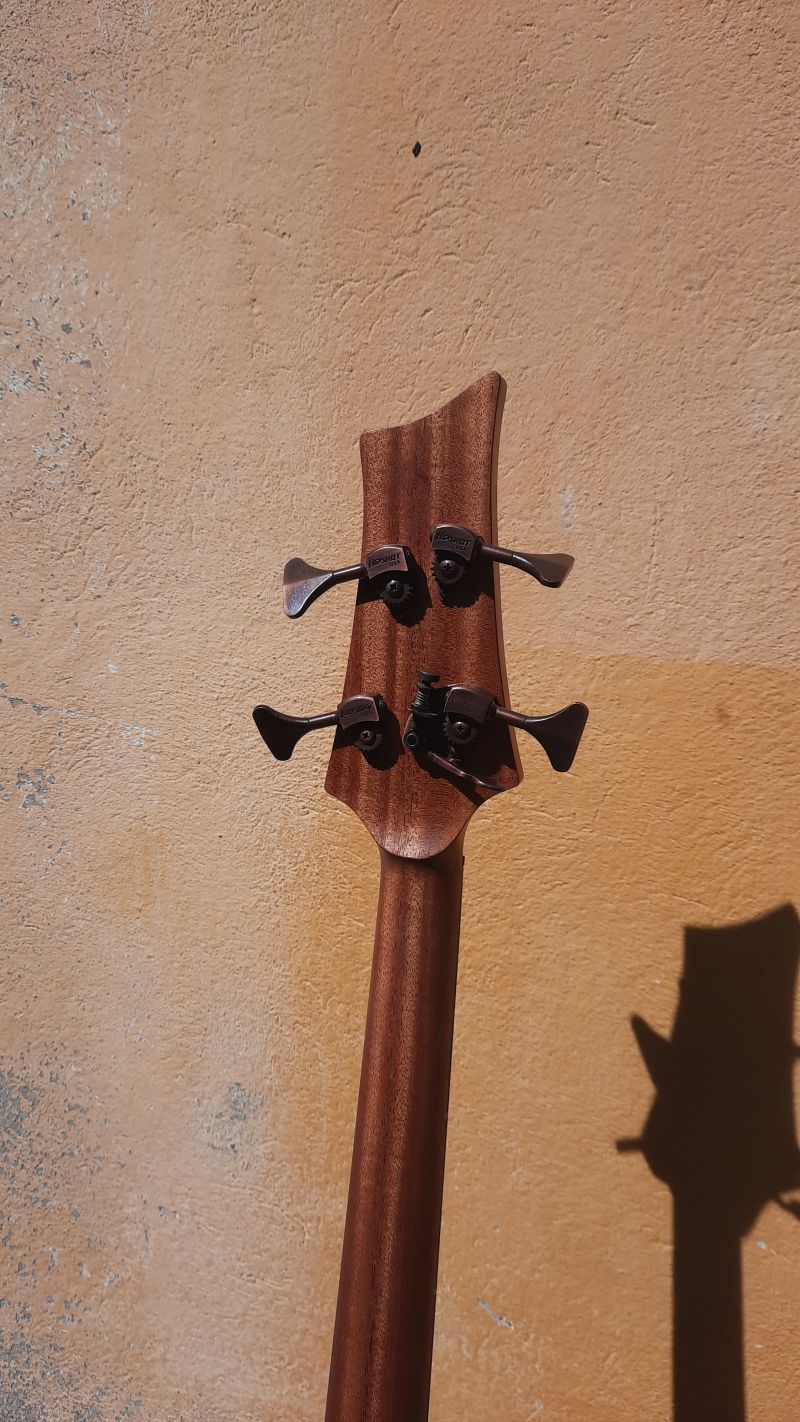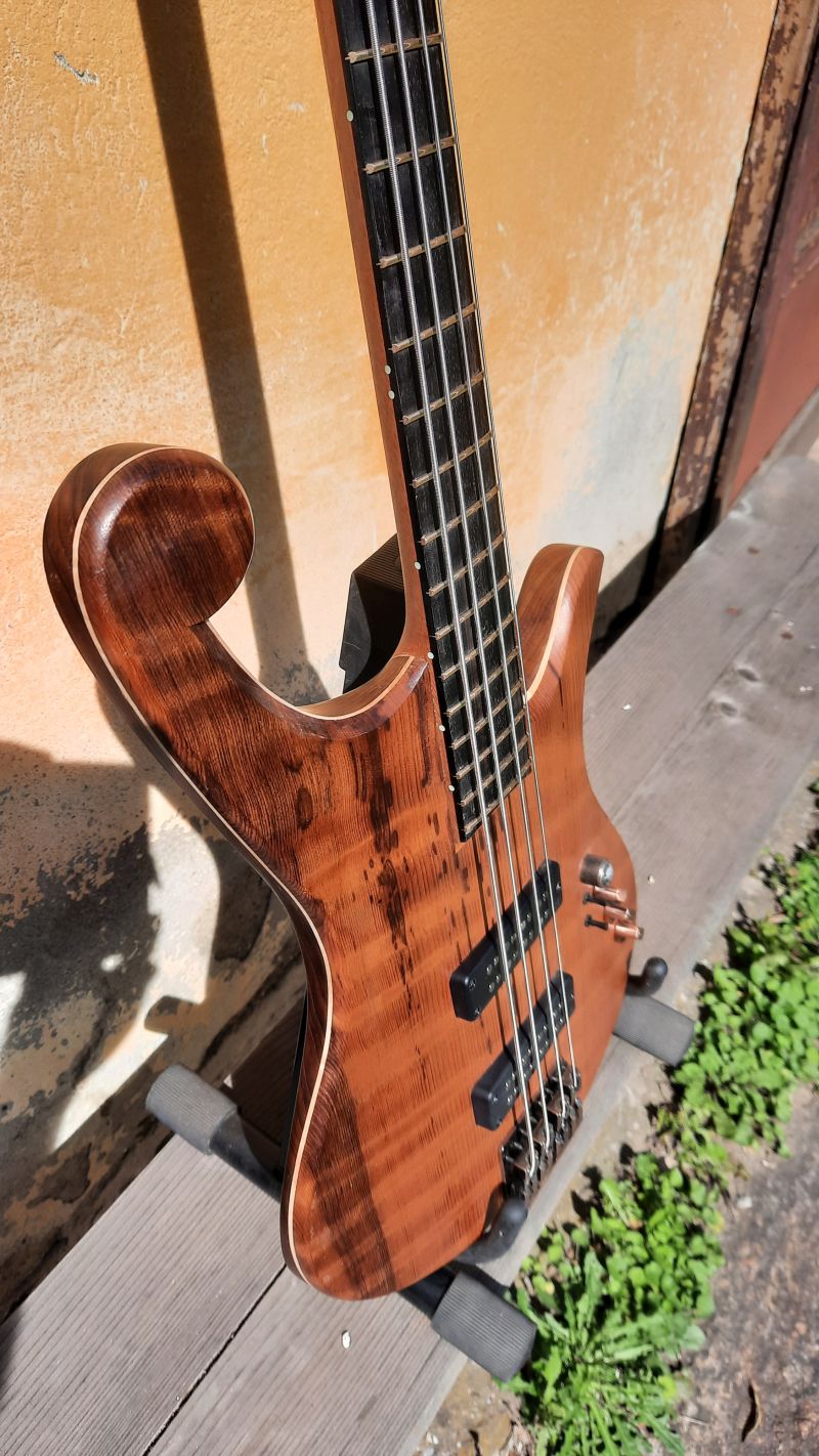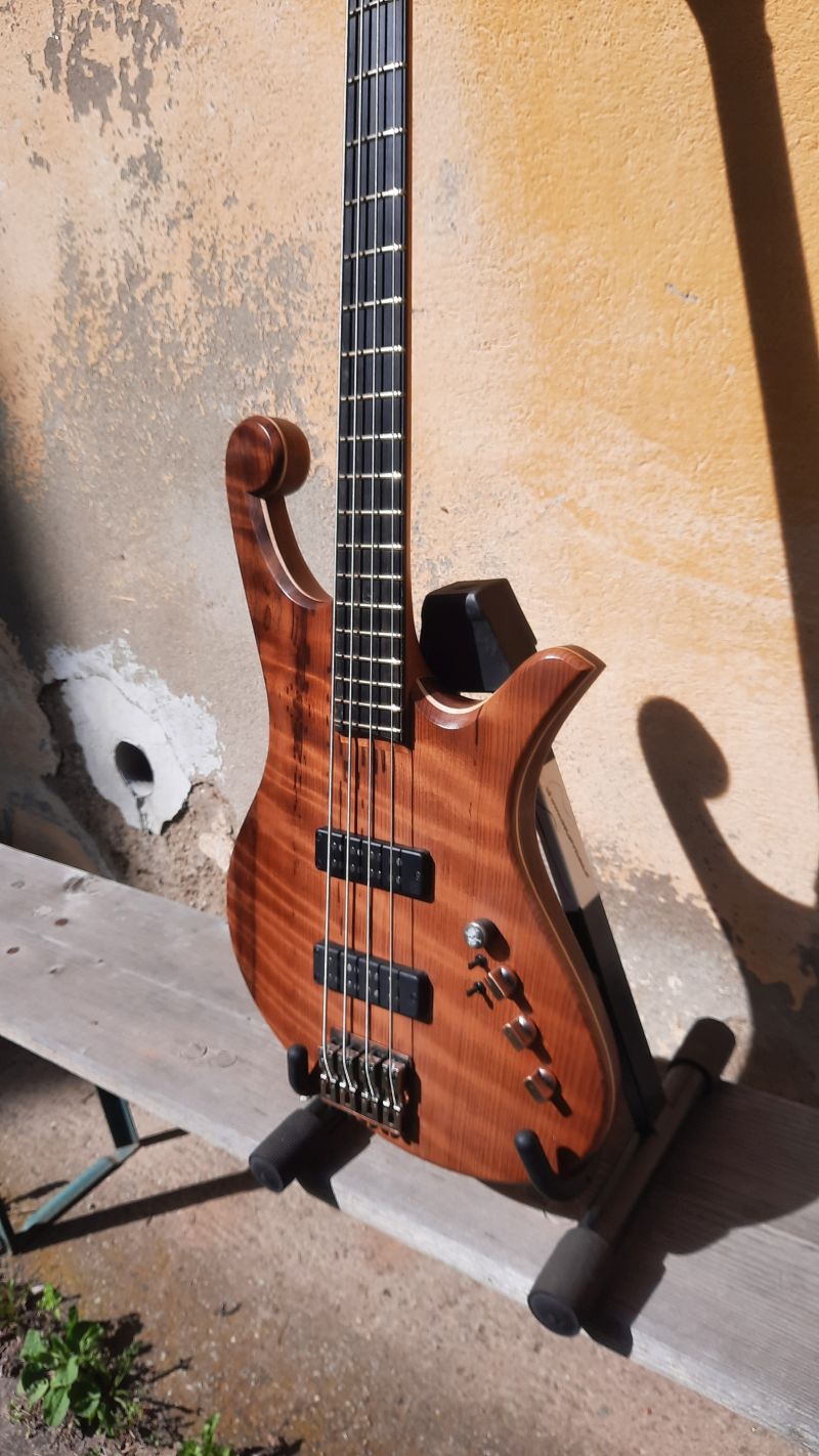 / 4 String Bass, E-Bass / Von fuzzo Scroll 4 string Custom Bass „Alex 4“ Doubleneck splitable Custombass „Lukas“ Akustik Bass „Bertha“ 4 Custom Bass „Corona 4“ 2018 E-Bass „Invader 4“ Custom electric Bass „Helium 4“ Corona Four 2010 Custom electric Bass „Pico“ Timi K Custom electric Bass The Scroll Bass Alex Mensur 34 Zoll, durch den Korpus gehender hals, 22 Bünde Specs Gewicht 3.5kg / 7.7lbs Elekronik Nordstrand dual coil Pickups Humbucker, splitbar zu parallel/singel/seriell jeweils, Noll 2 Band Elektronik, Volume – aktiv/passiv push/pull Poti, Balance Poti, Höhen- und Bassregler Material Thermo Sumpfeschen Korpus, geflammtes Rotholz – Redwood Decke mit Ahorn Furnieren, Kaya Mahagoni Hals, Ebenholz Griffbrett compound Radius ab 7,25 Zoll, Schaller 2000 vintage Copper Brücke, Hipshot vintage copper ultralight Mechaniken (Sonderanfertigung), De Tuner, PU matte Oberfläche, Karbonsattel